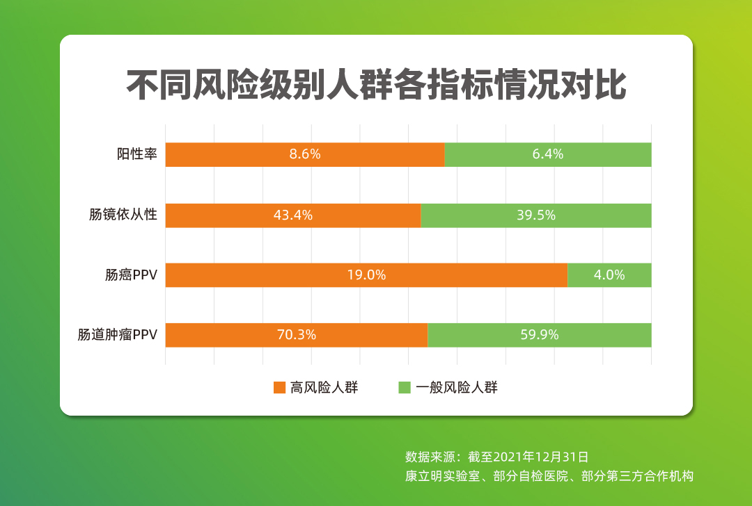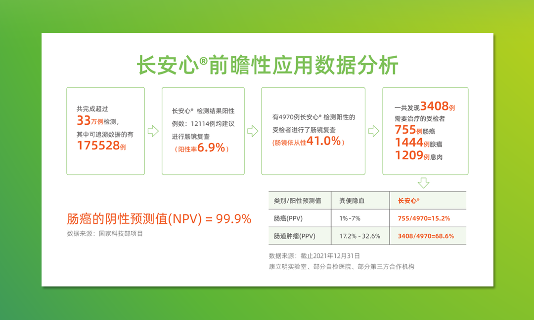 截至2021年12月,作為持續(xù)披露真實世界應用數(shù)據(jù)的腸癌糞便基因檢測產(chǎn)品,長安心®共完成33萬例前瞻性應用檢測,其中175528例應用數(shù)據(jù)可追溯,12114例受檢者長安心®檢測結(jié)果陽性(陽性率6.9%),其中4970例長安心®檢測結(jié)果陽性的受檢者進行了腸鏡復查(腸鏡依從性41.0%),一共發(fā)現(xiàn)3408例需要治療的受檢者,其中755例腸癌,1444例腺瘤,1209例息肉。長安心®對腸道腫瘤的預測值(PPV)為68.6%(其中腸癌的陽性預測值為15.2%),來自國家科技部項目的數(shù)據(jù)顯示,長安心®的陰性預測值更是高達99.9%。