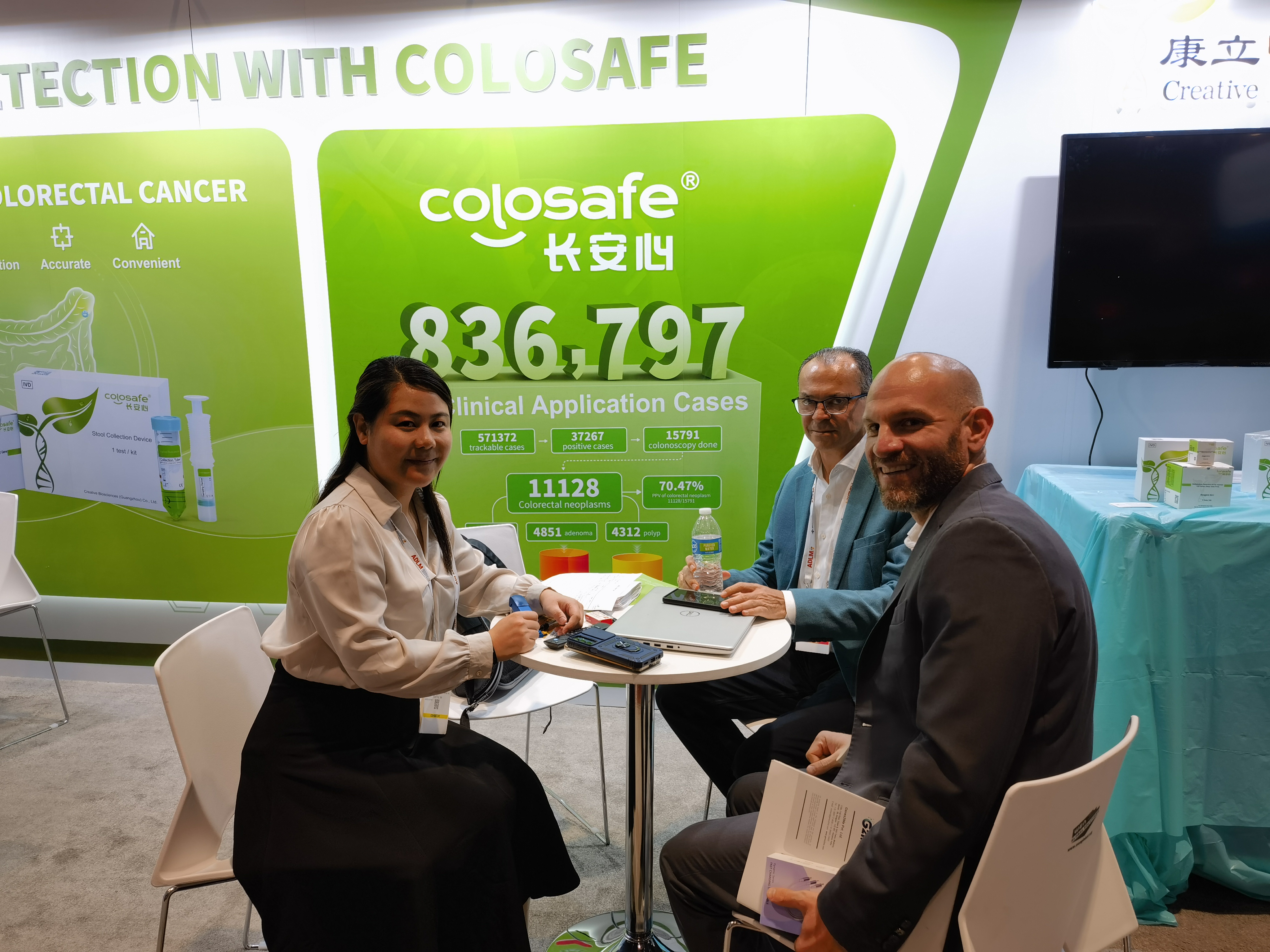 值得注意的是,康立明生物是本次展會中唯一一家提供結(jié)直腸癌早期檢測測試(包括分子測試)的生物科技公司。在展會期間不斷有來自世界各地的訪客對長安心®糞便DNA腸癌檢測技術(shù)感興趣。長安心®糞便DNA檢測技術(shù)是通過解讀糞便中脫落腫瘤細(xì)胞的基因異常改變,幫助醫(yī)生發(fā)現(xiàn)患者早期腸癌病變情況,有希望將結(jié)直腸癌阻斷在早期階段,從而達(dá)到預(yù)防和根治結(jié)直腸癌的目的。