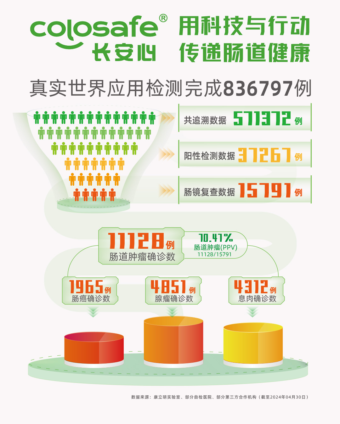 截至2024年4月30日,長安心®共完成836797例檢測,其中可追溯數(shù)據(jù)571372例。檢測結(jié)果陽性37267例(陽性率6.52%),均建議進(jìn)行腸鏡復(fù)查。其中,15791例檢測陽性受檢者進(jìn)行了腸鏡復(fù)查(腸鏡依從性42.37%),共發(fā)現(xiàn)11128例需要治療的受檢者,其中腸癌1965例、腺瘤4851例、息肉4312例。長安心®腸癌陽性預(yù)測值(PPV)12.44%,腸道腫瘤陽性預(yù)測值(PPV)70.47%,檢測性能優(yōu)異。