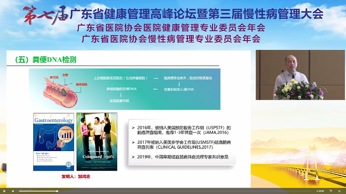 廣東省人民醫(yī)院協(xié)和醫(yī)療中心主任、廣東省醫(yī)院協(xié)會醫(yī)院健康管理專委會主任委員陳煉以《中國癌癥早篩的機遇與挑戰(zhàn)》為題作主題演講時,重點介紹了糞便SDC2基因甲基化PCR檢測對結(jié)直腸癌早期診斷的效果。